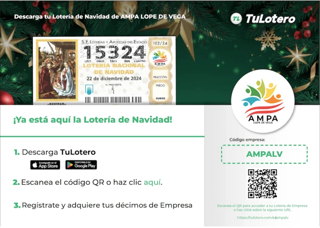 Como novedad, este 2024 puedes adquirir tu décimo de la Lotería de Navidad de forma rápida y sencilla a través del siguiente enlace: TuLotero – AMPA Lope de Vega o pulsando el siguiente botón: