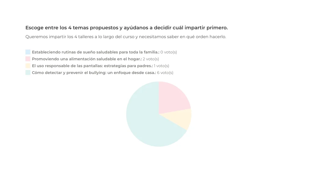 Después de recibir vuestros votos, ya podemos anunciar cuál será el primer taller que organizaremos este curso. El tema más votado ha sido “Cómo detectar y prevenir el bullying: un enfoque desde casa”, con 6 votos. ¡Muchas gracias a todos los que habéis participado!