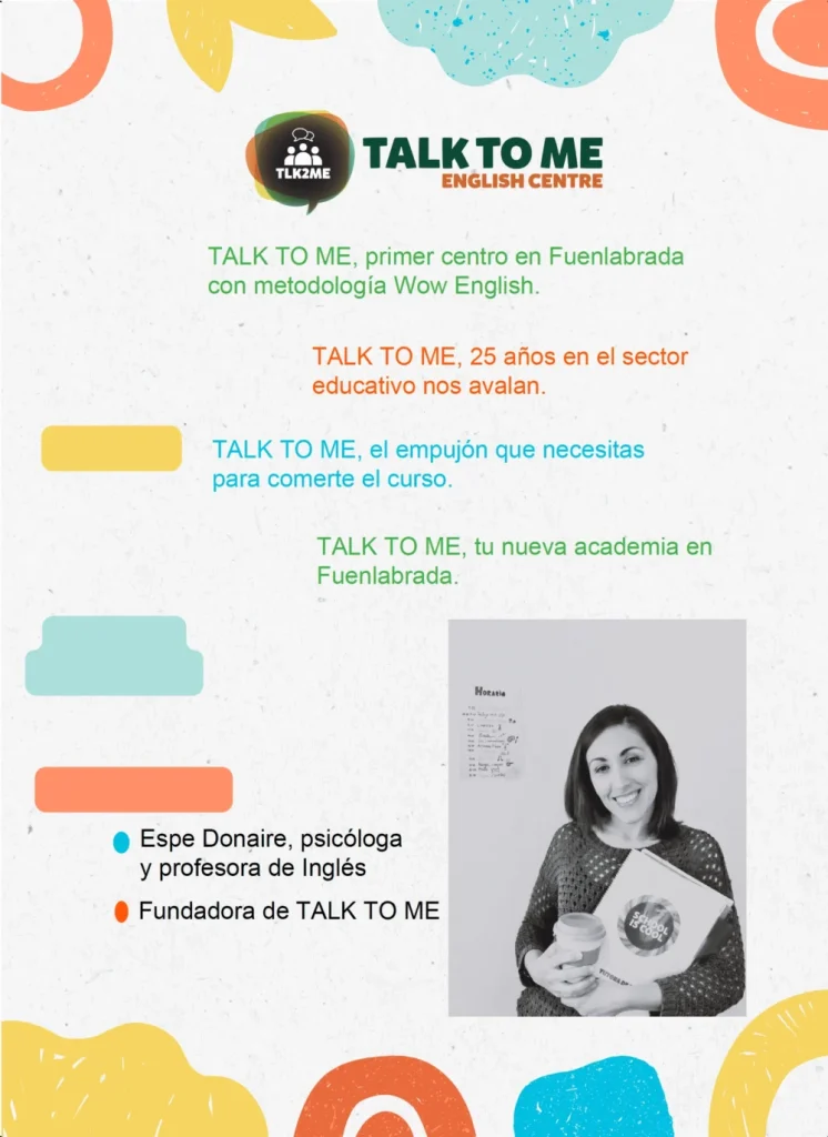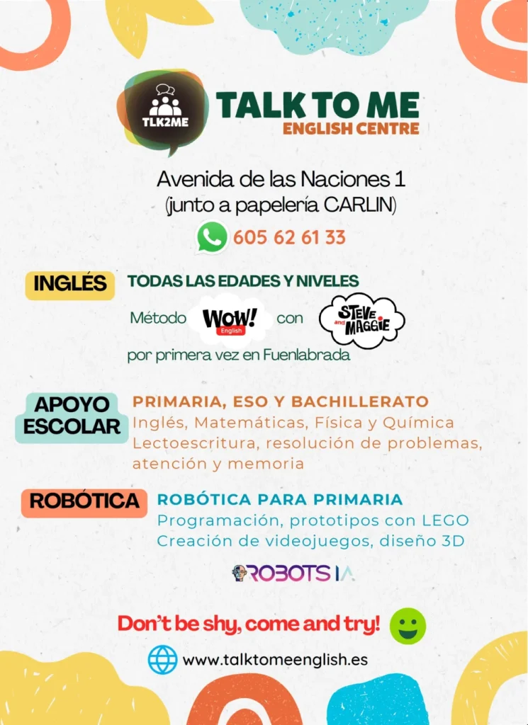 TALK TO ME está orientado a alumnos de Primaria y Secundaria. Ofrecemos por primera vez en Fuenlabrada el método de inglés para niños (de 3 a 11 años) Wow English con los personajes Steve and Maggie, robótica para Educación Primaria y apoyo escolar.
